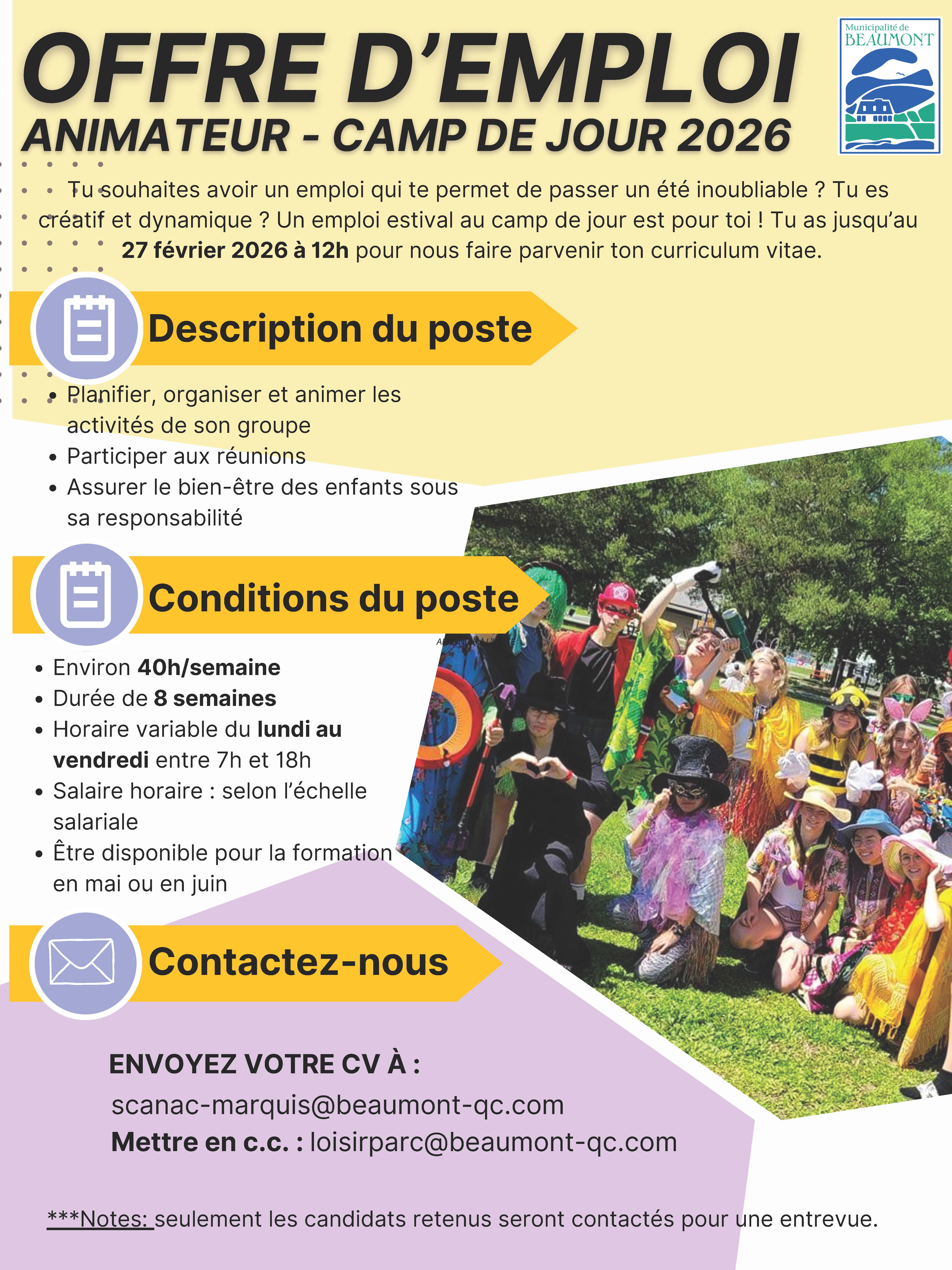 Tu as jusqu’au 27 février 2026 à 12h pour nous faire parvenir ton curriculum vitae à scanac-marquis@beaumont-qc.com